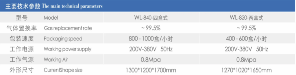 WL-840/820盒式氣調鎖鮮包裝機 產品概述: 該設備是專為食品級PP、PET材質的盒、碗、杯、多格餐盒及鋁箔盒等包裝而設計的一款新型氣調鎖鮮封盒機。操作簡單,故障率低。盒裝產品,攜帶方便,檔次高,也深受越來越多消費者的喜愛。該設備已申請國家實用新型專利。 配置: 程控系統(tǒng):日本三菱(松下)、國產信捷等名牌控制元器件2.氣控系統(tǒng):臺灣名牌亞德客氣動元器件3.外箱體材質:304不銹鋼。 產品外觀: 樣品 產品特點 真空氣調包裝機是一種新型食品保鮮技術,利用各種保護性氣體所起的不同作用,抑制引起食品變質的大多數微生物生長繁殖,并使活性食物( 果蔬等植物性食品 ) 呼吸速度降低,從而使食品保鮮并延長保鮮期。應用領域 : 真空氣調包裝機廣泛適用于:生鮮肉、熟肉制品、魚類、家禽、貝類、水果、咖啡、茶葉、蔬菜、面包等超市配送食品。真空氣調包裝具有使食品保質、保鮮、保色、保形、保味的特點,風靡歐美市場。真空保鮮包裝機主要針對盒裝肉類,熟食等產品進行 、紫外線殺菌、抽真空、充氣 然后封口操作。高度自動化是其最大技術特點,真空保鮮包裝機主要通過對盒內食品的抽真空,和充保鮮氣體操作來確保產品得以更好的保存,和延長保鮮時間。本機可配置充氮氣 氧氣 二氧化碳充氣裝置,可延長保鮮時間。適合熟食,生鮮等食品的鎖鮮包裝. ?